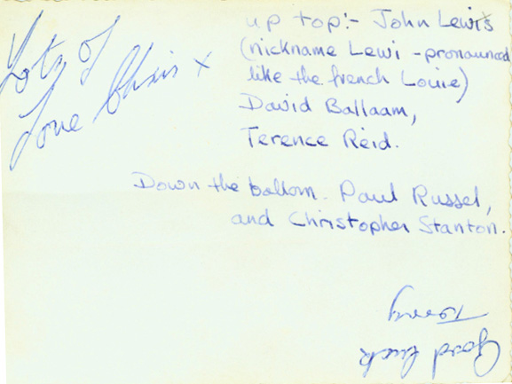 L to R: Dave Ballam (drums), Chris Stanton (lead vocals and rhythm guitar), Terry Reid (bass guitar), John Lewis (nicknamed 'Lewi' by the band) (Piano), Paul Russell (lead guitar).